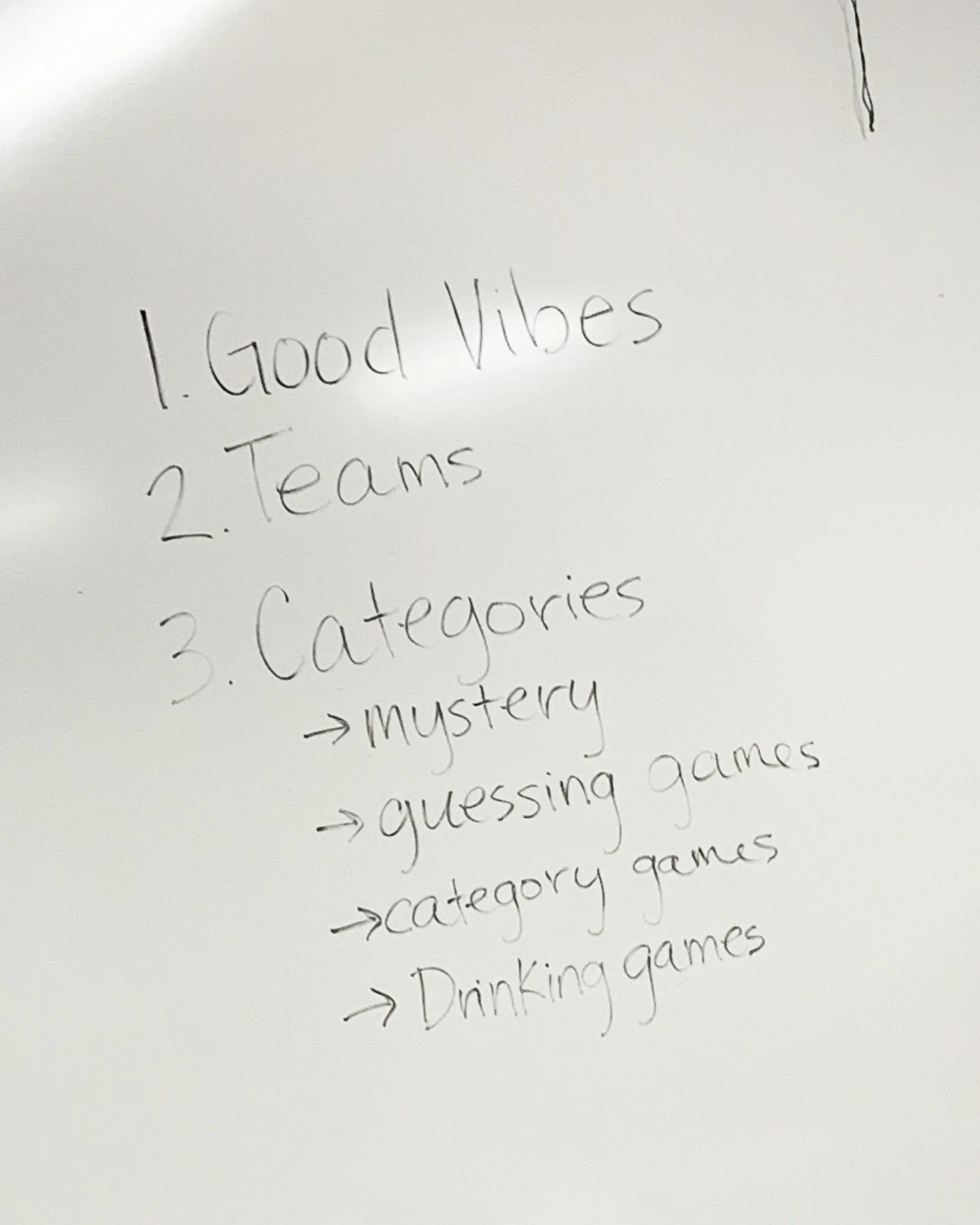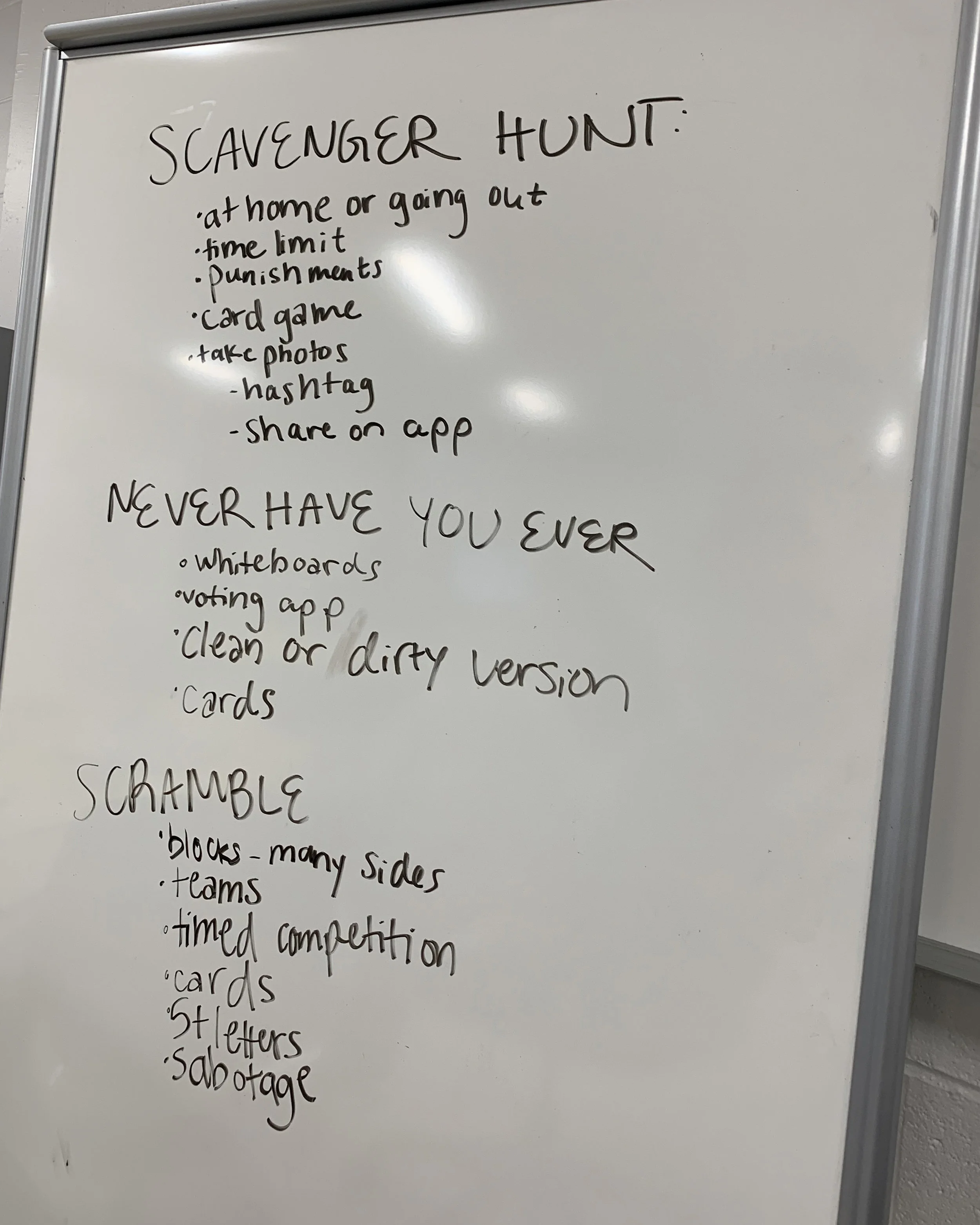 Before designing, our team brainstormed ideas that would make party games, and what would make bad party games. We grouped together similar ideas and created three categories we wanted to incorporate into our game: Good Vibes, Teams, and Categories. We each individually created a list of game ideas and came back to discuss our ideas. Our top three ideas were a scavenger hunt game, never have you ever, and scramble. We then put each idea to the test to decide which would make the best party game while factoring in originality, playability, and level of fun, and the scavenger hunt idea passed that test.